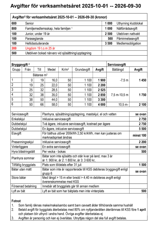Avgifter för medlemskap, båtplats och annat bestäms vid årsmötet.