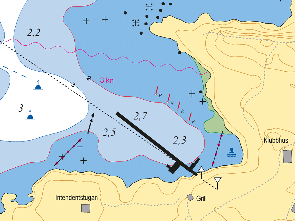 All förtöjning vid brygga och svajboj sker på eget ansvar. Vid vind över 10 m/sek är det klokt att lägga till så att fören pekar mot vinden, för att skydda både brygga och bojfästen.