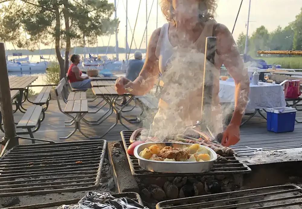 I grillstugan kan sex grillhärdar hållas glödande samtidigt. Grillningen sker med kol eller briketter. Engångsgrillar undanbedes vänligt men bestämt!